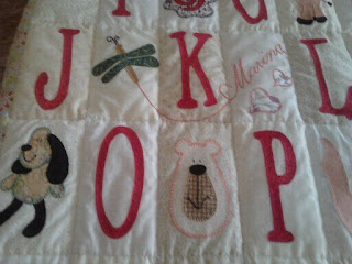 Aqui se puede ver más detalladamente los dibujos y los detalles de la colcha que le hicimos a Marina.